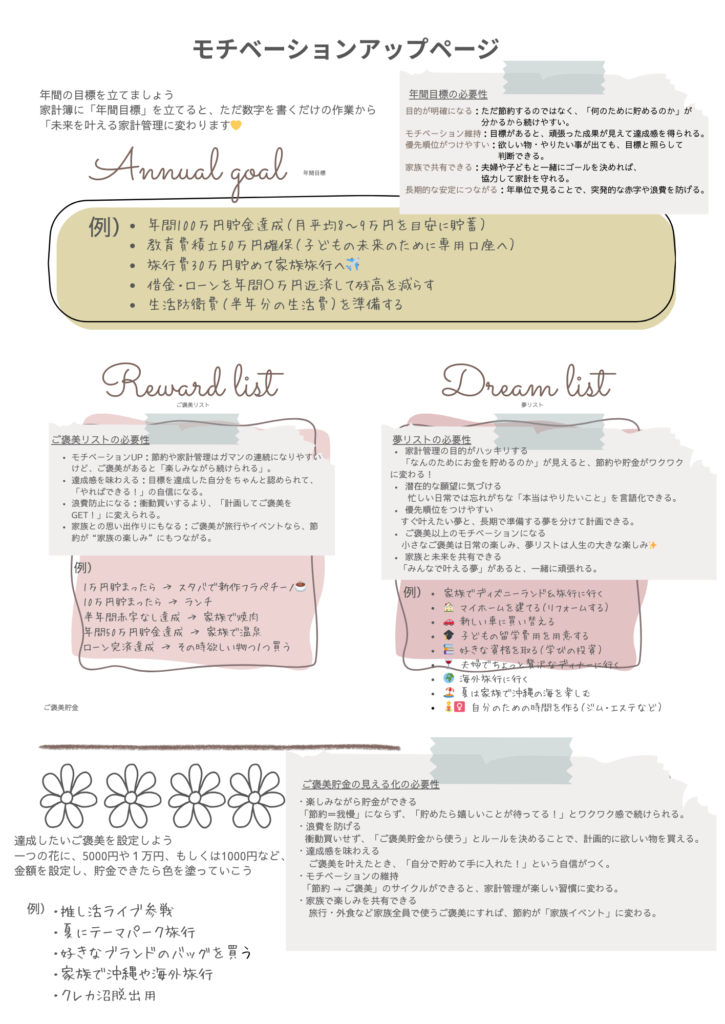 このページは、あなたの“理想の家計”を叶えるための目標を分かりやすく整理できるシートです。