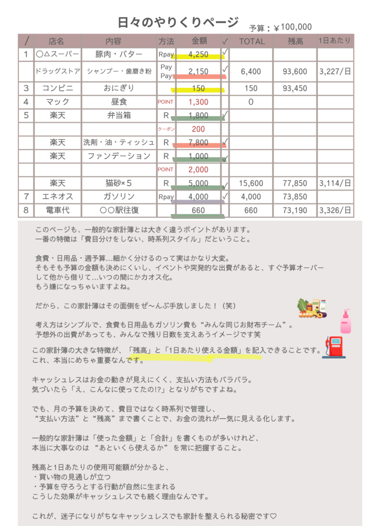 このページは、毎日の支出を“そのまま”記録するだけで、お金の流れが自然と見えるようになる、やりくり専用ページです。